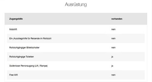 Jede SBB-Bahnstation verfügt über eine eigene Internet-Seite, die sich via Google aufrufen lässt. Auf der Internet-Präsenz sind die wichtigsten entsprechenden Informationen unter "Ausrüstung & Mobilität am Bahnhof" zusammengefasst. Wie sieht es mit den Zugängen zu den Perrons aus, gibt es einen Mobilift oder eine rollstuhlgängige Toilette etc.? (Das Foto zeigt die Angaben zum Bahnhof Erstfeld SBB).