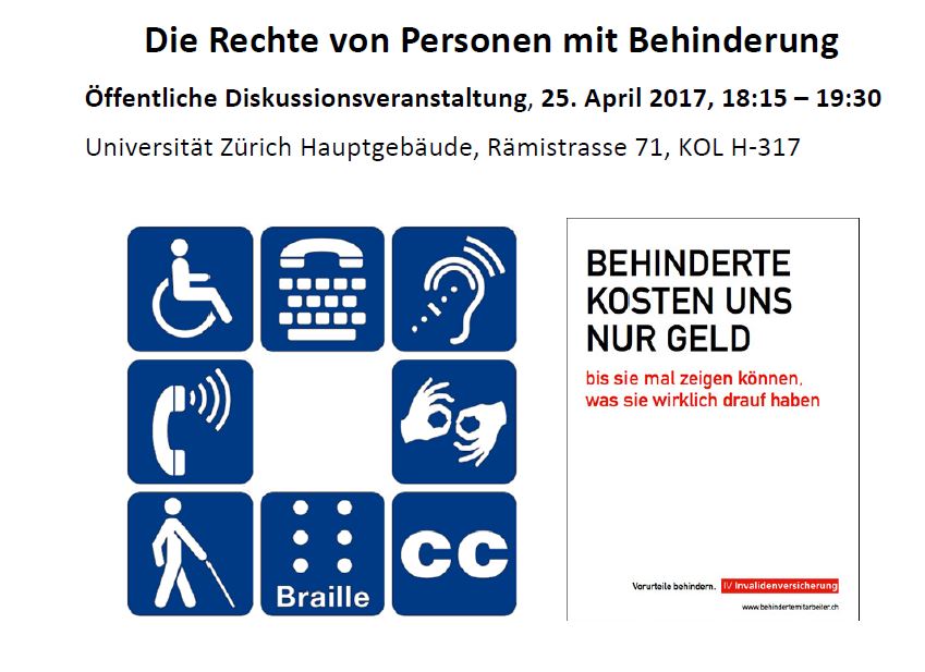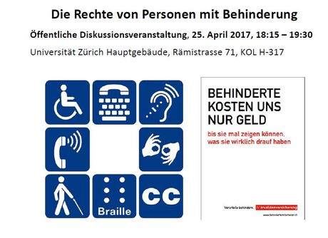 "Die Rechte von Personen mit Behinderung" lautet der Titel der Diskussionsveranstaltung vom Dienstag, 25. April, an der Universität Zürich (18.15 - 19.30 Uhr).
