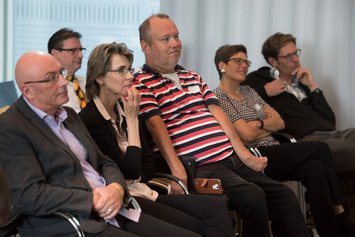Fünf der sieben Referentinnen und Referenten der Präsentation der Studie über die Persönliche Zukunftsplanung (PZP) mit Menschen mit körperlicher und intellektueller Beeinträchtigung und ihr Beitrag zu Veränderungen am Montag in Zürich: Von rechts nach links: • Tobias Zahn, Trainer in Persönlicher Zukunftsplanung PZP, Leiter Büro WINklusion, • Judith Adler, Dozentin Forschung und Entwicklung, Institut für Behinderung und Partizipation, Interkantonale Hochschule für Heilpädagogik in Zürich, • Thomas Z’Rotz, Botschafter und Moderator in Persönlicher Zukunftsplanung • Christina Settelen, Moderatorin in Persönlicher Zukunftsplanung, Pflegeexpertin und Bereichsleiterin Wohnhaus "Blotzi 10" der Vereinigung Cerebral Basel • Thomas Holzgang, Moderator in Persönlicher Zukunftsplanung, Bereichsleitung Eingliederung IV-Stelle Kanton Schwyz. (Foto: Dorothea Hochuli)