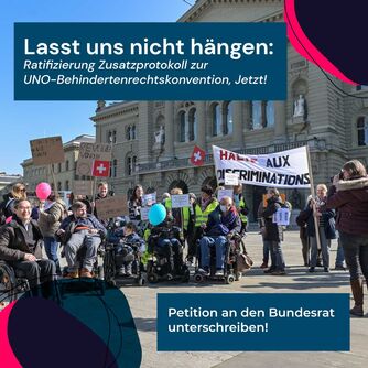 Vor mehr als acht Jahren hat die Schweiz die UNO-Behindertenrechtskonvention (UNO-BRK) unterzeichnet. Dieses Menschenrechtsübereinkommen spricht Menschen mit Behinderungen die volle und gleichberechtigte Teilhabe an der Gesellschaft zu. Trotzdem werden Menschen mit Behinderungen immer noch ungleich behandelt und ihre Rechte in vielerlei Hinsicht verletzt. Deshalb braucht es in der Schweiz ein Zusatzprotokoll zur UNO-BRK. Es ermöglicht Menschen mit Behinderungen, sich bei Verletzung ihrer Rechte direkt bei der UNO zu beschweren. Mit einer Petition fordern wir deshalb vom Bundesrat: Lasst uns nicht hängen: Ratifizierung Zusatzprotokoll zur UNO-Behindertenrechtskonvention, Jetzt!